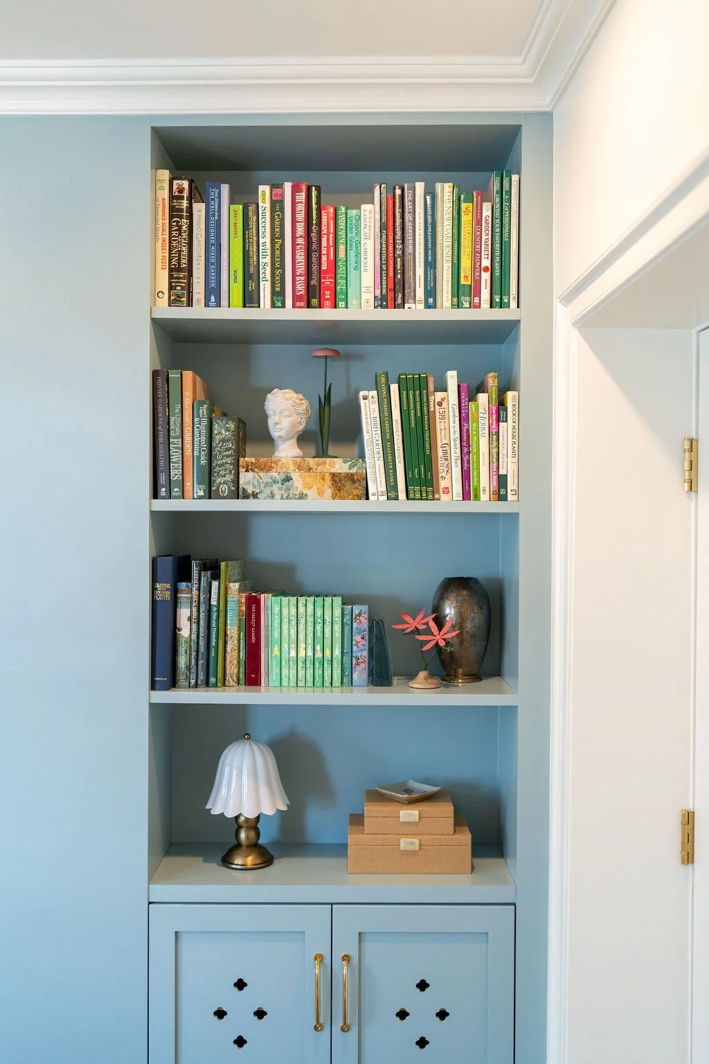 The Gardener guest room distills this heritage into a single space. Soft sage, moss, and terracotta recall the greenhouse floor. Ribbed glass and filtered light echo the glow of paneled conservatories. Pressed flora and antique seed packets share the walls with mushroom spore prints, trellis motifs, and warm brass accents. Every detail whispers of cultivation—of what it means to coax life from earth and light.