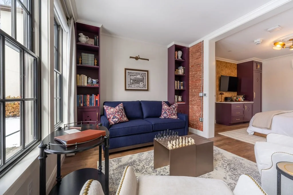 The General suite honors a pivotal moment in both local and national history. Designed to reflect the strategy and leadership of 1777, the space draws inspiration from the Brandywine landscape, with tones of moss, parchment, and deep navy echoing the colors of the battlefield. Guests are invited to chart their own course in a room that serves as a refuge and a reminder of the enduring courage that shaped the nation.